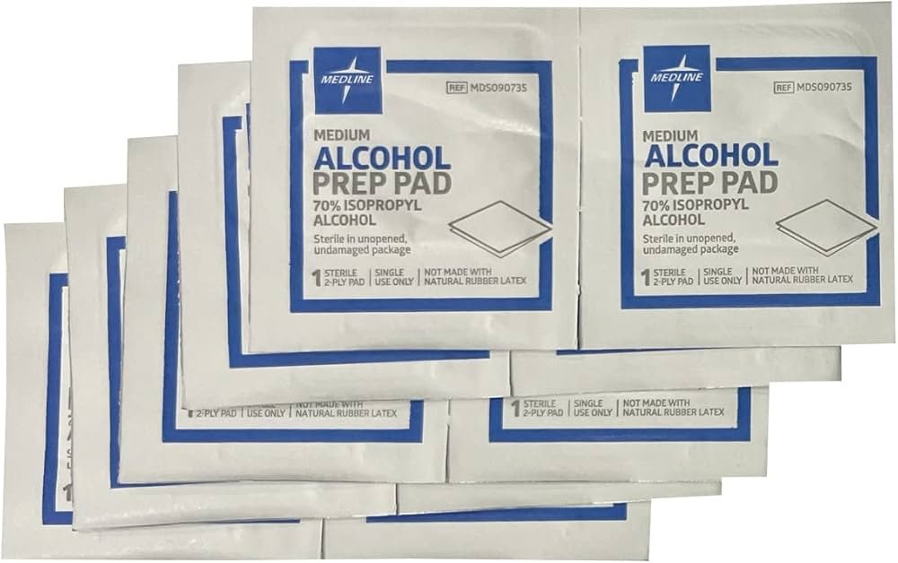 Pre-moistened antiseptic wipes for disinfecting skin prior to injections. Individually sealed for single-use convenience and hygiene.