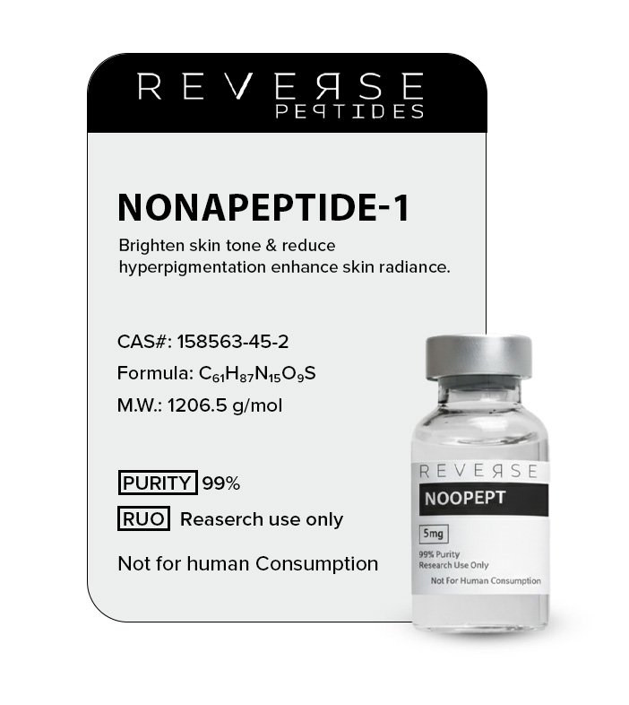 Nonapeptide-1 is a synthetic, biomimetic peptide used in cosmetic and preclinical research to reduce hyperpigmentation and even skin tone. It acts primarily as an antagonist of α-melanocyte-stimulating hormone (α-MSH) signaling in melanocytes and has been shown in laboratory studies to lower melanin synthesis by down-regulating key melanogenic pathways (MC1R, MITF, tyrosinase and related enzymes). Nonapeptide-1 is commonly investigated for topical brightening formulations and ex-vivo skin models where controlled reduction of melanin production is desired.